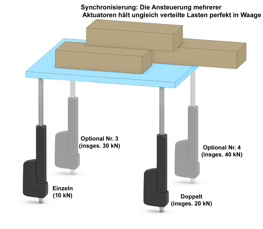 Die Synchronisierung erlaubt die integrierte Bewegung von bis zu vier Aktuatoren. Werden mehrere mit Synchronisierungsoption ausgestattete Einheiten installiert, profitieren Konstrukteure von einem stabileren und möglicherweise schnelleren Hub. Es ist-keine zusätzliche Führung erforderlich und asymmetrische Lasten können besser beherrscht werden.