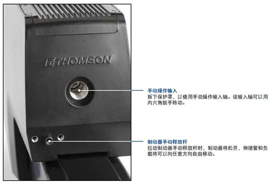 當(dāng)Electrak XD配置了制動(dòng)器手動(dòng)釋放和操作選項(xiàng)功能,即可允許伸縮管手動(dòng)釋放和/或手動(dòng)旋轉(zhuǎn)前后移動(dòng)。