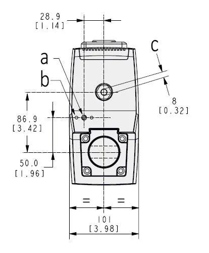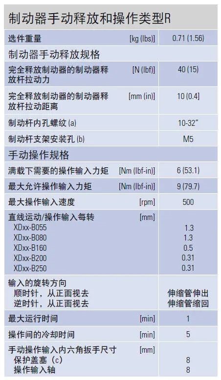接合后,制動(dòng)器手動(dòng)釋放裝置將松開制動(dòng)器上的伸縮管,拉動(dòng)制動(dòng)器釋放桿 (a),伸縮管便可在外加負(fù)載和/或重力的作用下進(jìn)行伸縮。同時(shí),提供了安裝孔 (b) 以便于安裝支架,作為遠(yuǎn)程操作釋放桿的線纜組件的支撐。如要完全釋放制動(dòng)器,需要用40N的作用力將釋放桿拉動(dòng)10mm。