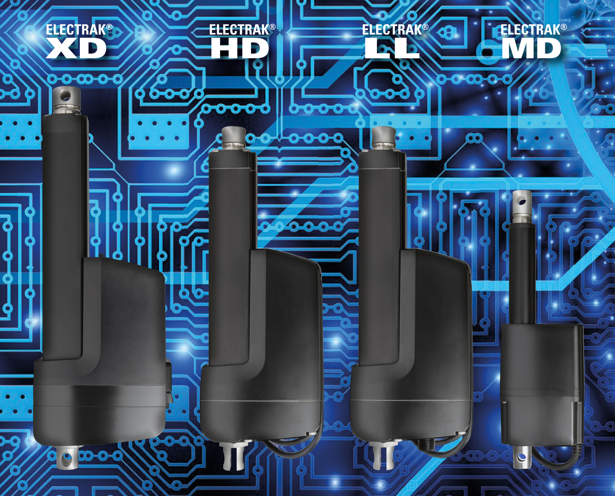 The Electrak XD, HD, LL, and MD actuators are engineered to meet the diverse demands of material handling applications, delivering an optimal balance of power, precision, and intelligent control. The Electrak XD delivers hydraulic-level force in a fully electric design, making it ideal for heavy-duty lifting and automation, while eliminating the maintenance and inefficiencies of hydraulic systems. The Electrak HD combines high power with integrated controls, removing the need for external components and simplifying installation. Designed for continuous operation, the Electrak LL provides 100% duty cycle performance, making it well suited for high-throughput environments. Additionally, the Electrak MD, with its compact yet durable construction, is ideal for space-constrained applications that demand precise, intelligent motion control.